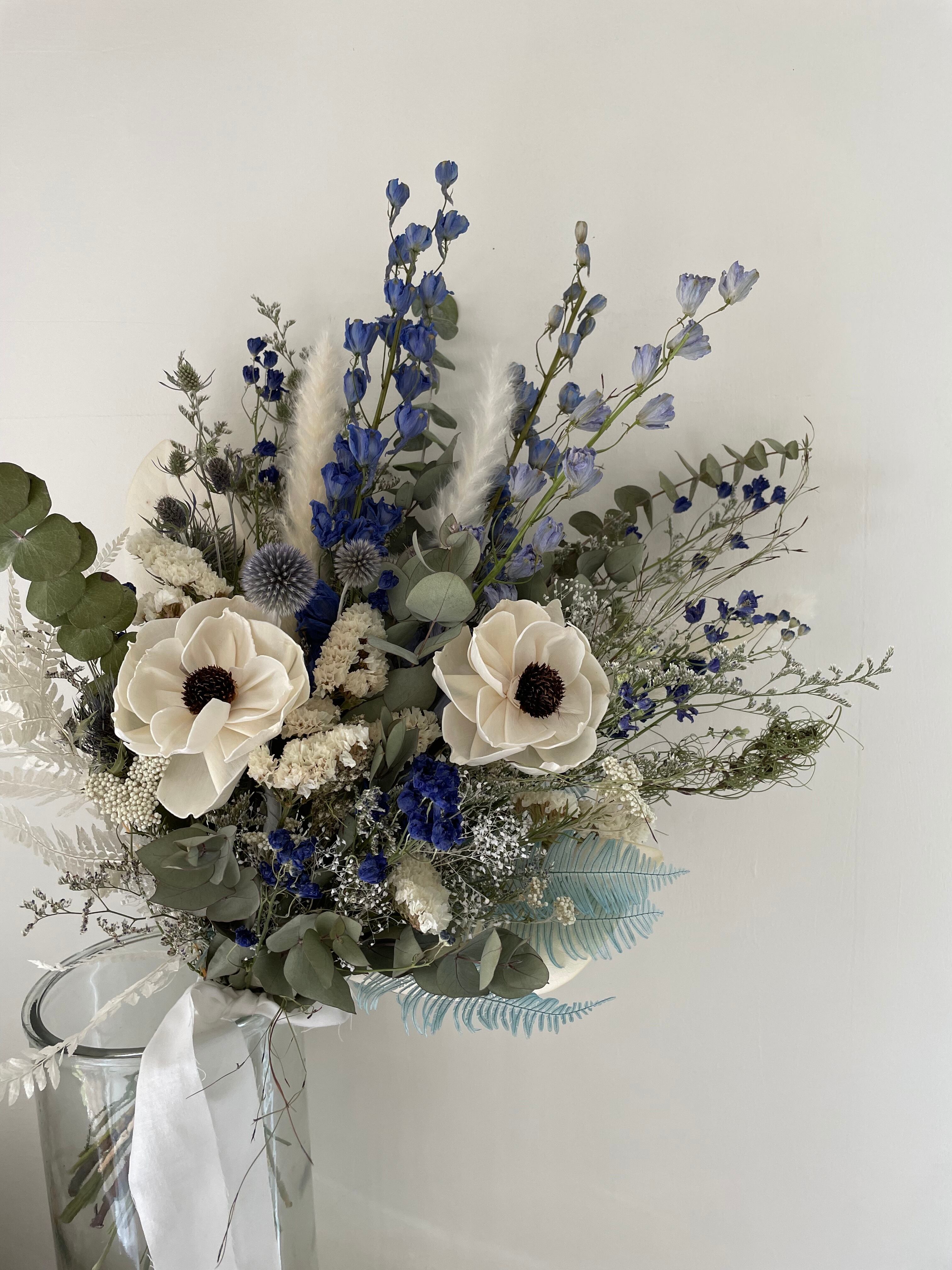 アネモネにユーカリ、テールリードやデルフィニウム、瑠璃玉アザミなどを合わせてスワッグを作りました^ ^