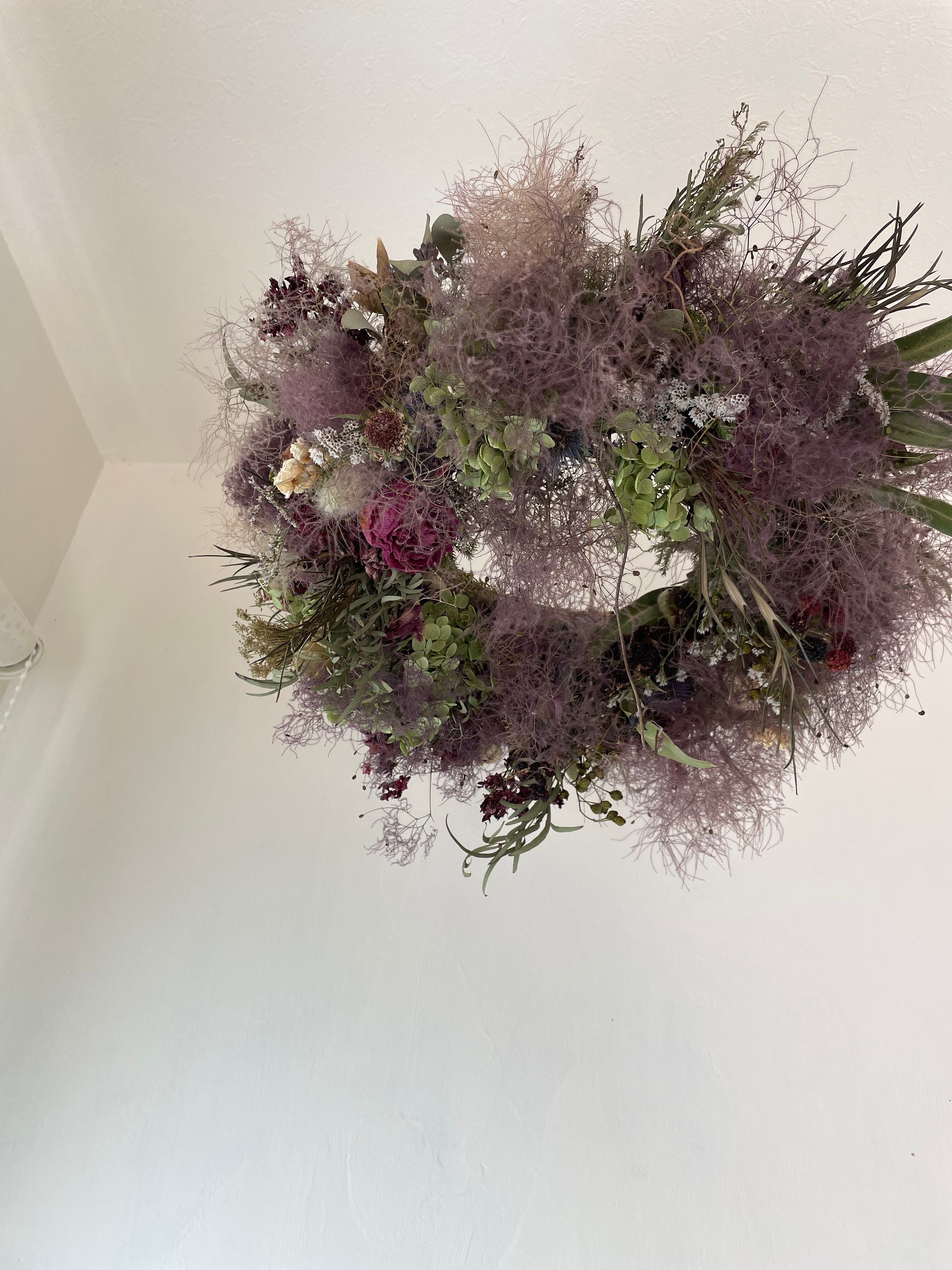 ふわふわスモークツリーにアナベルや芍薬、ハイブリッドスターチスなどを合わせてフライングリースを作りました。