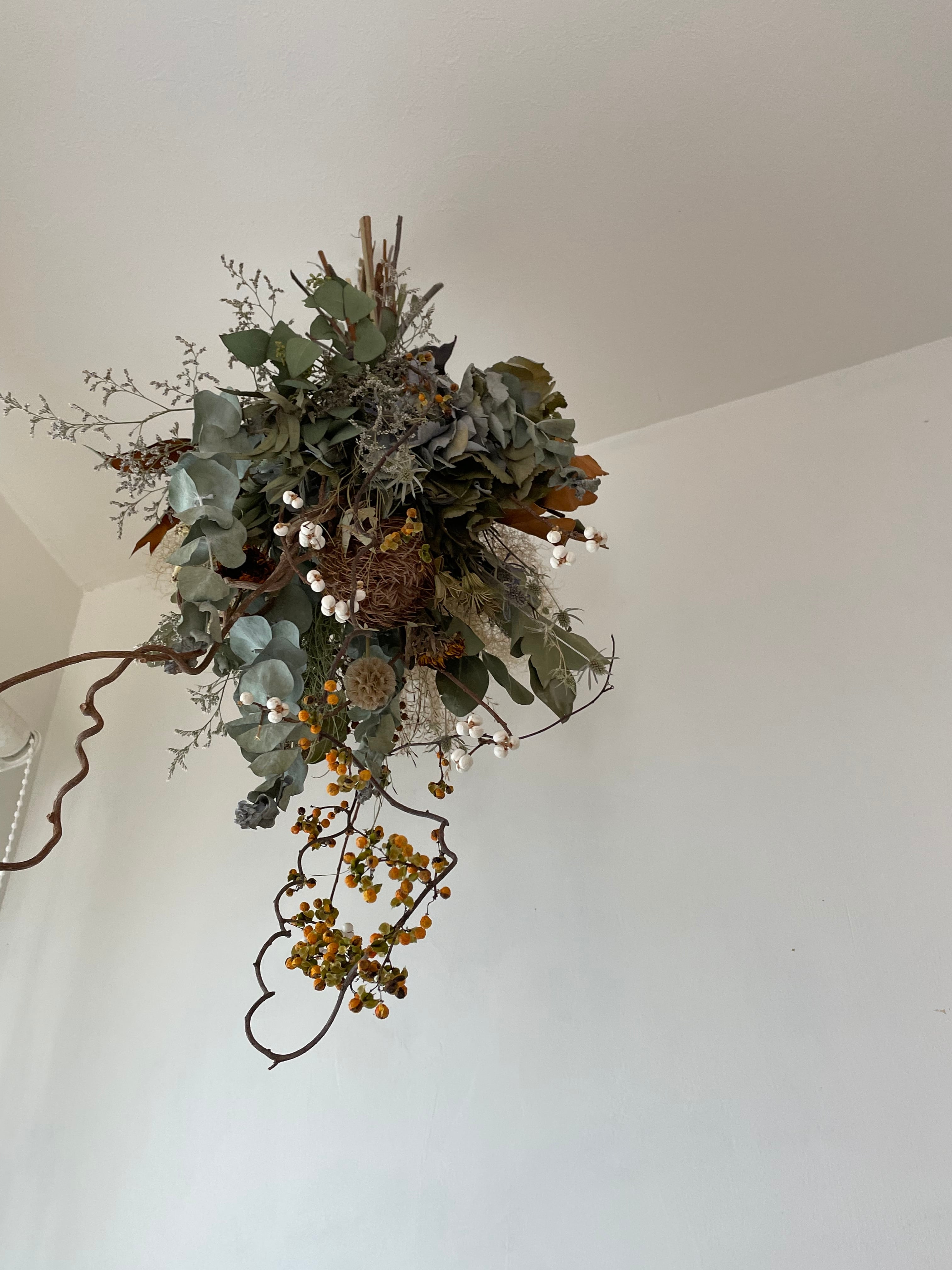 バンクシアやユーカリ、つるうめもどき、スモークツリーを合わせて吊り下げられるブーケを作りました。