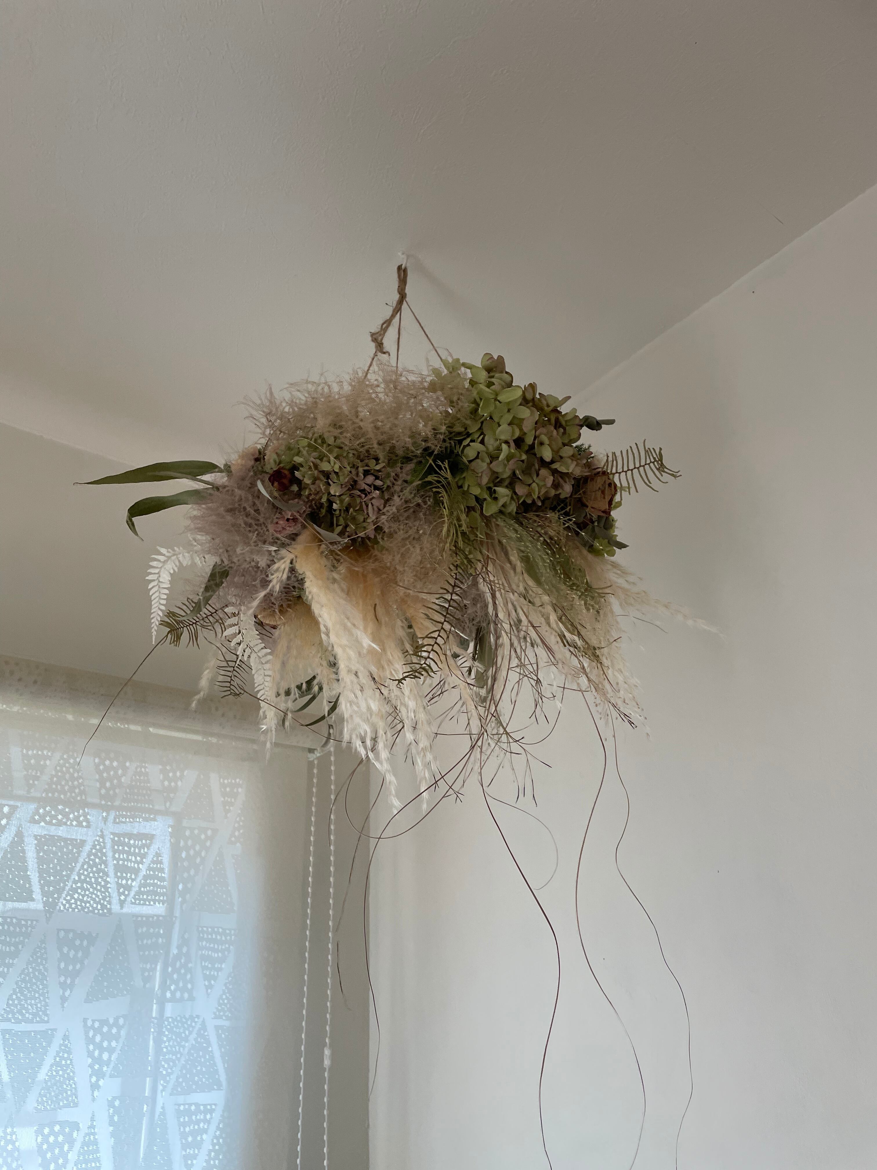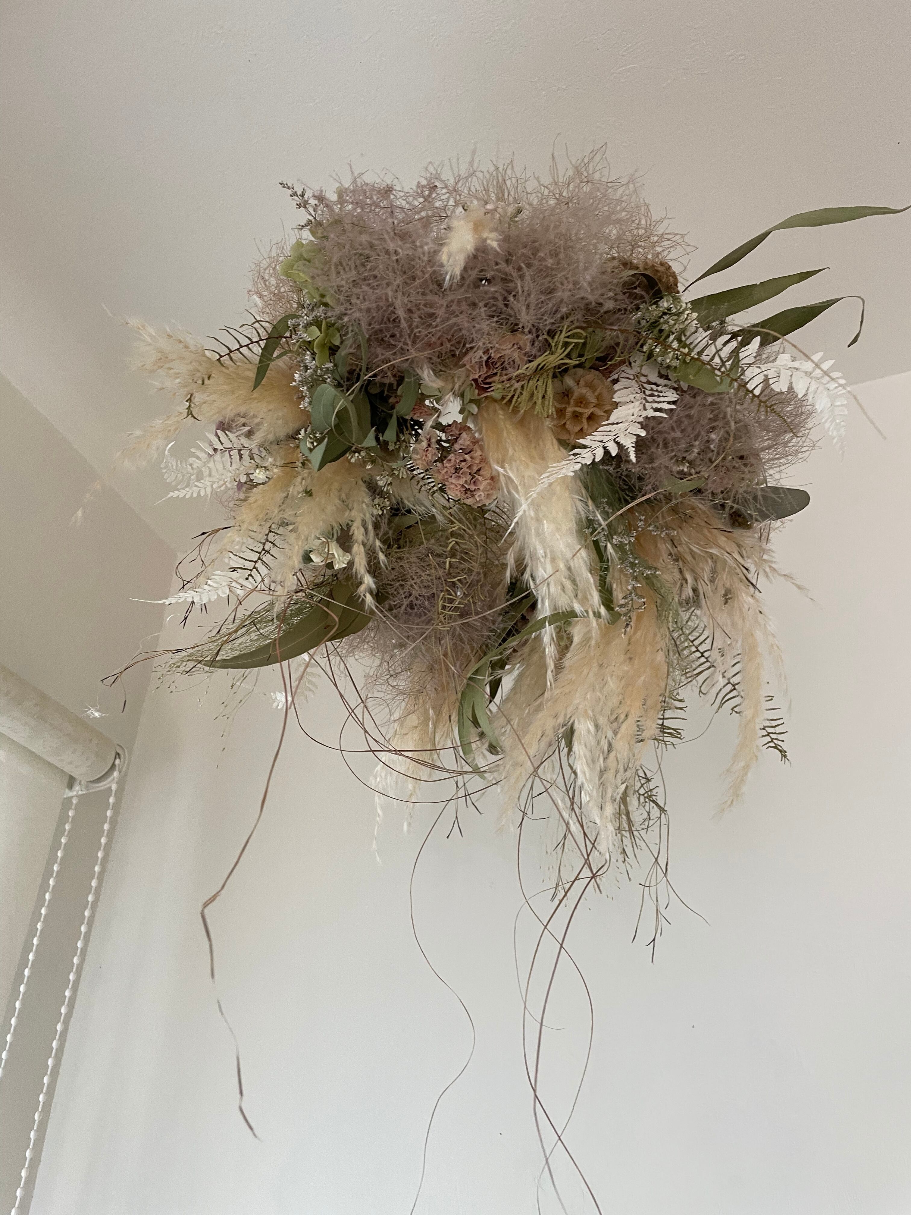 ふわふわスモークツリーに水無月やハイブリッドスターチス、パンパスグラスなどを合わせてフライングリースを作りました。