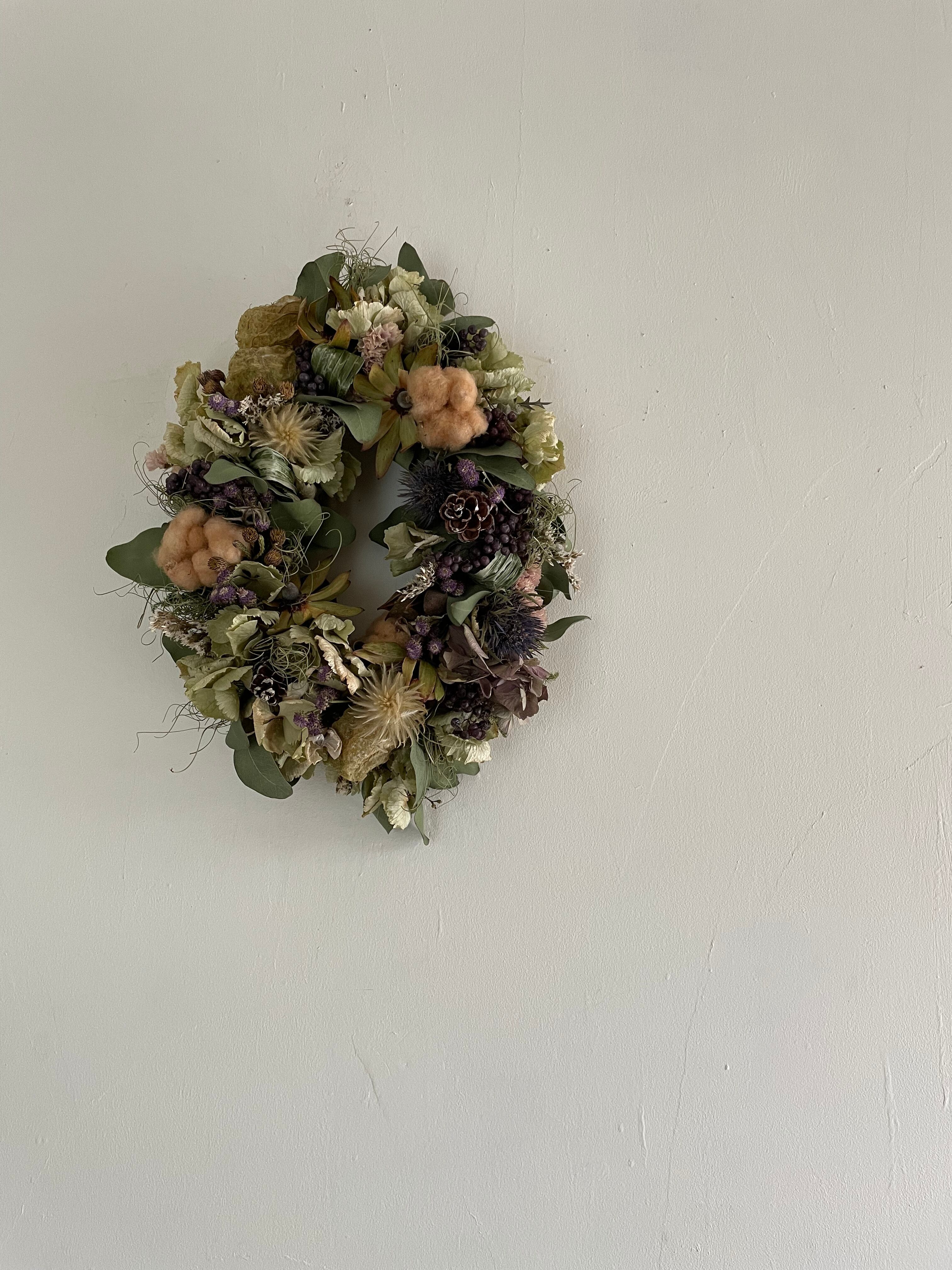 アンティーク紫陽花や木の実、コットンやペッパーベリーなどをいれてオーバルリースを作りました。