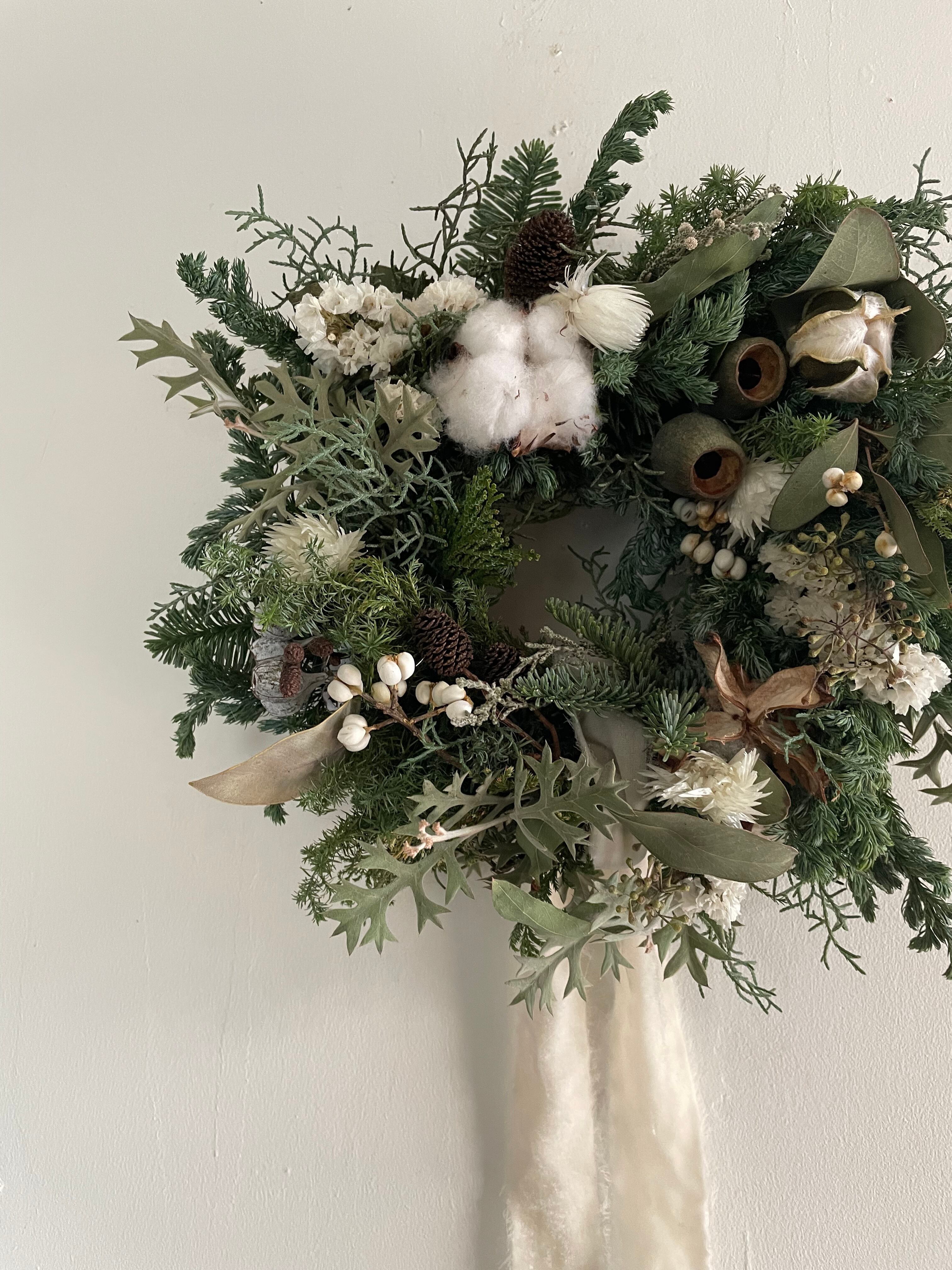 モミに和綿、シンカルファやナンキンハゼ、針葉樹をたっぷりいれたラウンドリースになります。