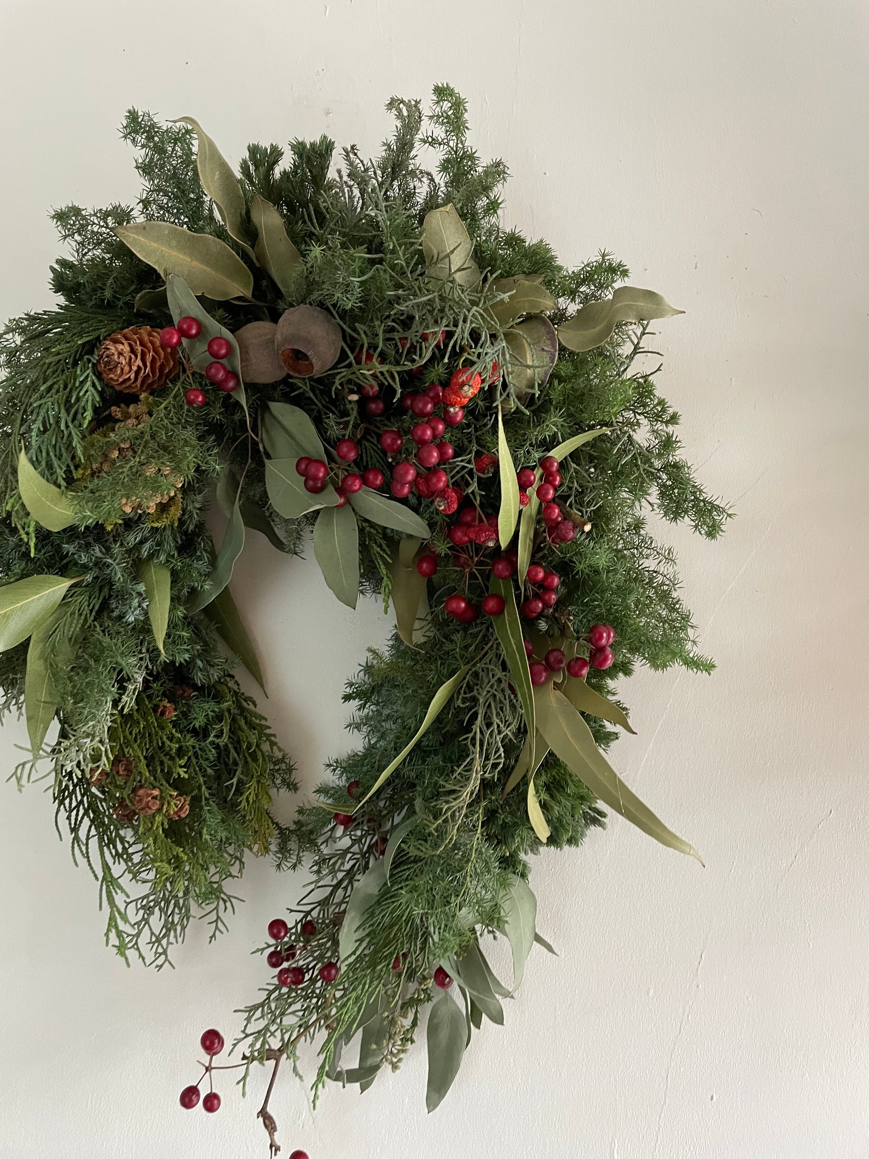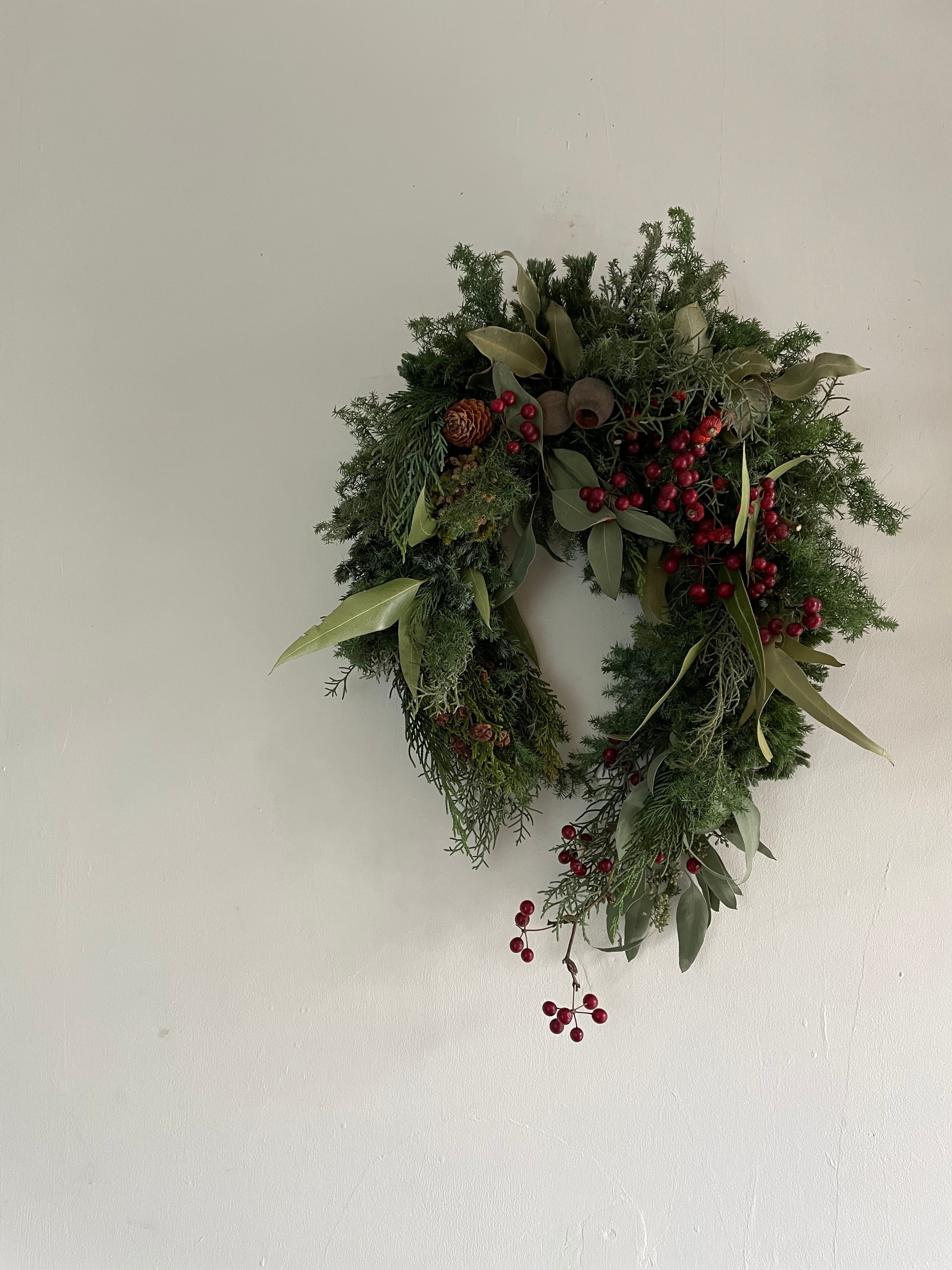 ベルガムナッツに山帰来、針葉樹、様々なグリーンを合わせてリースを作りました。