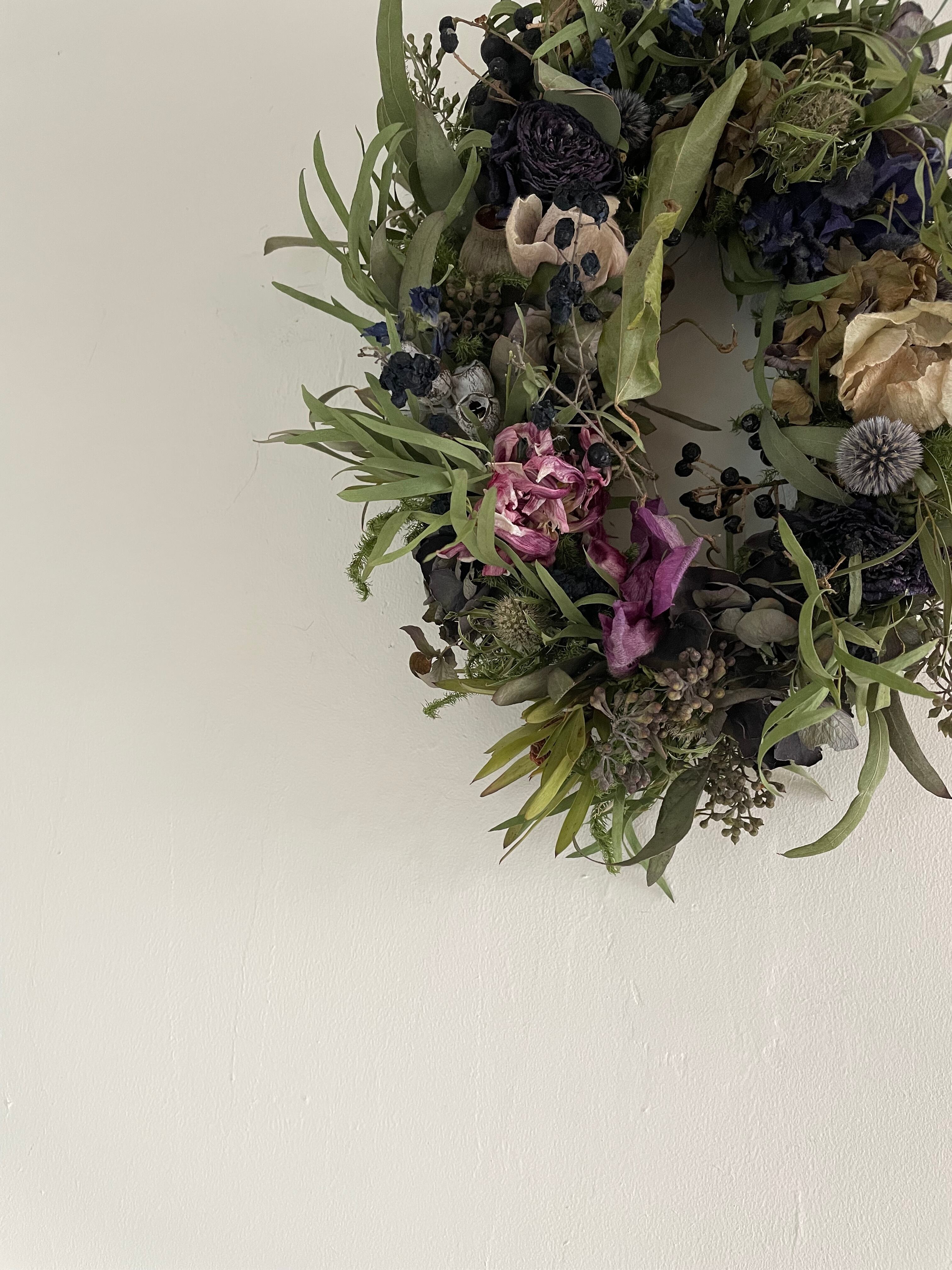 シックな色合いのラナンキュラス、アネモネ、チューリップやユーカリなどを一緒にリースを作りました。