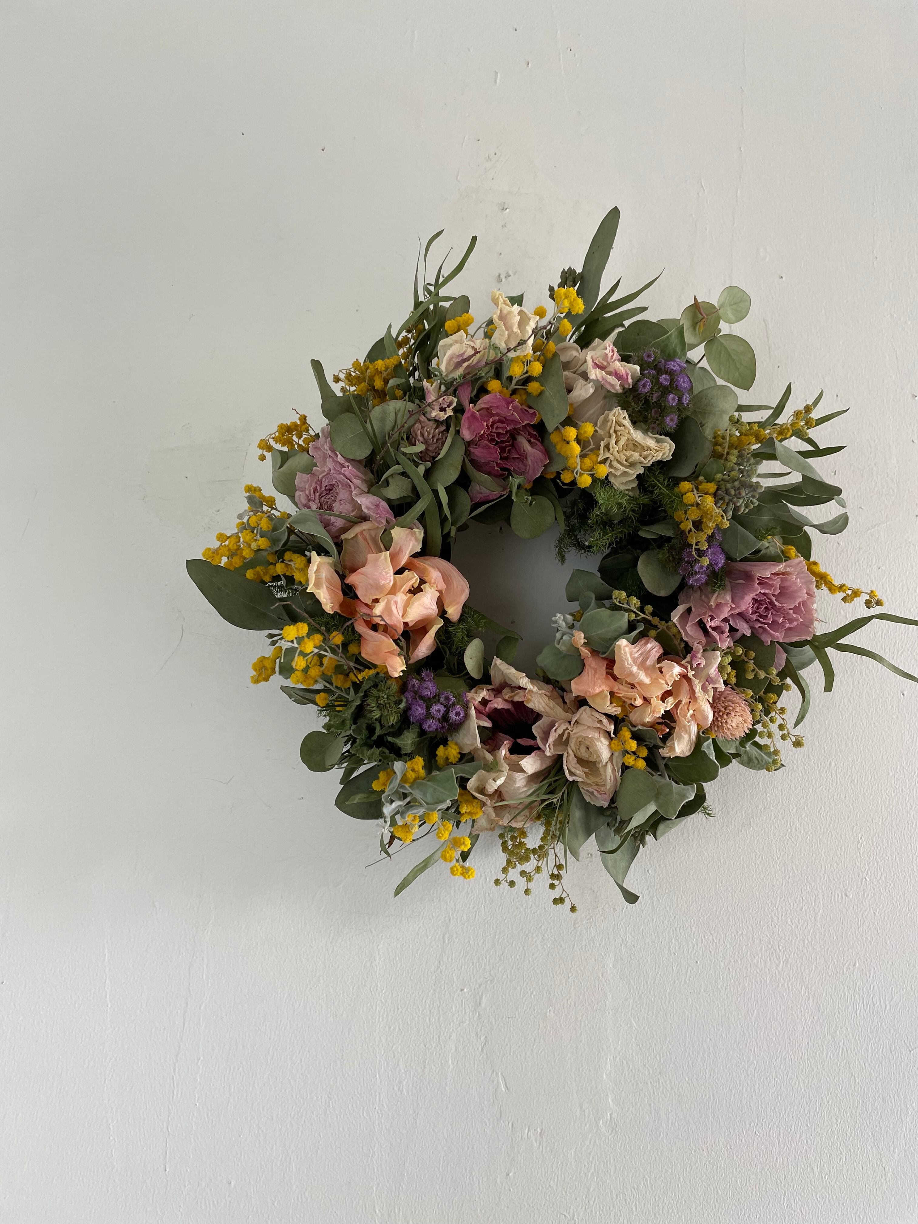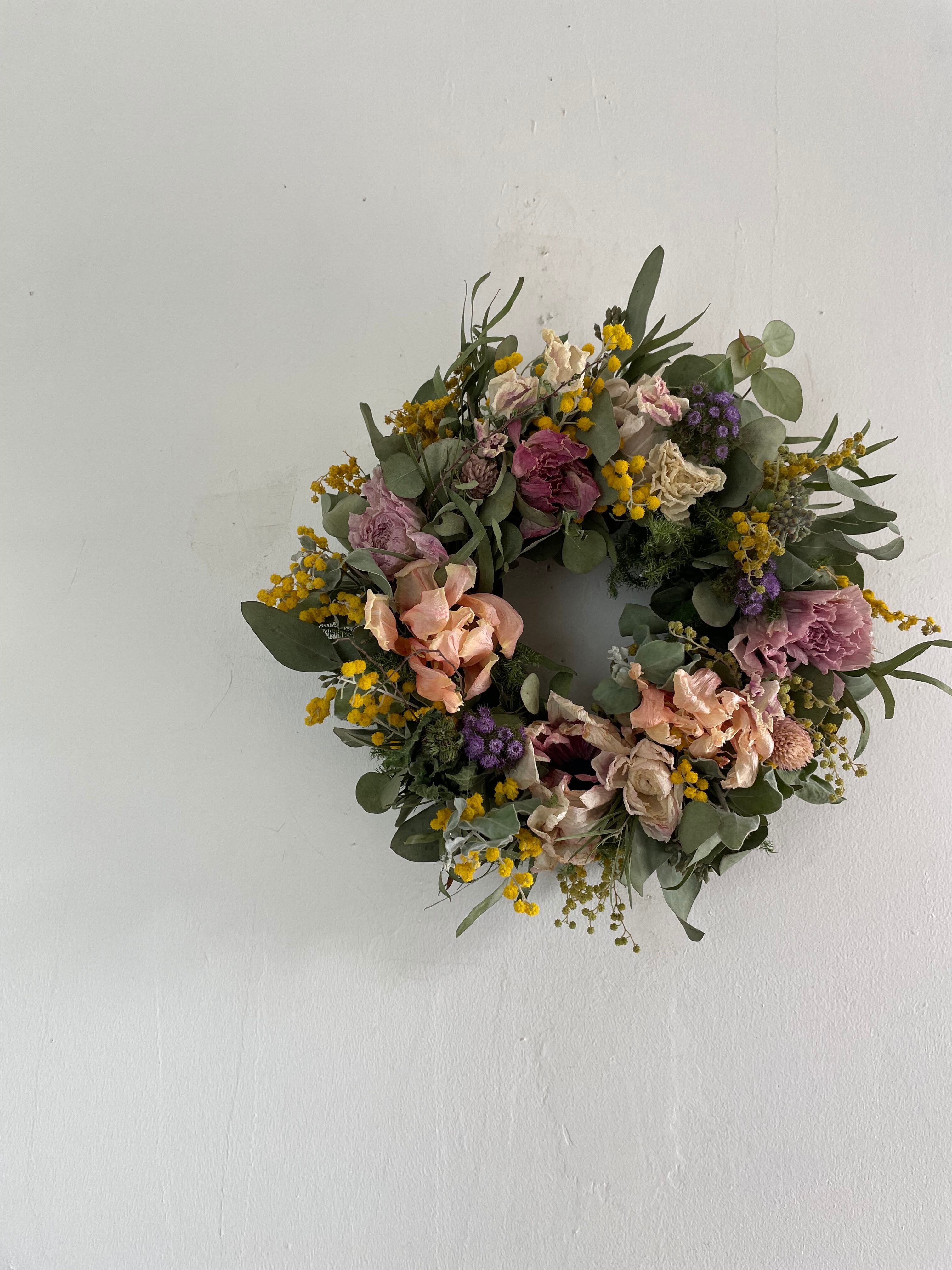 春を感じさせる色合いのラナンキュラス、アネモネ、チューリップやユーカリなどをたっぷりと入れてリースを作りました。