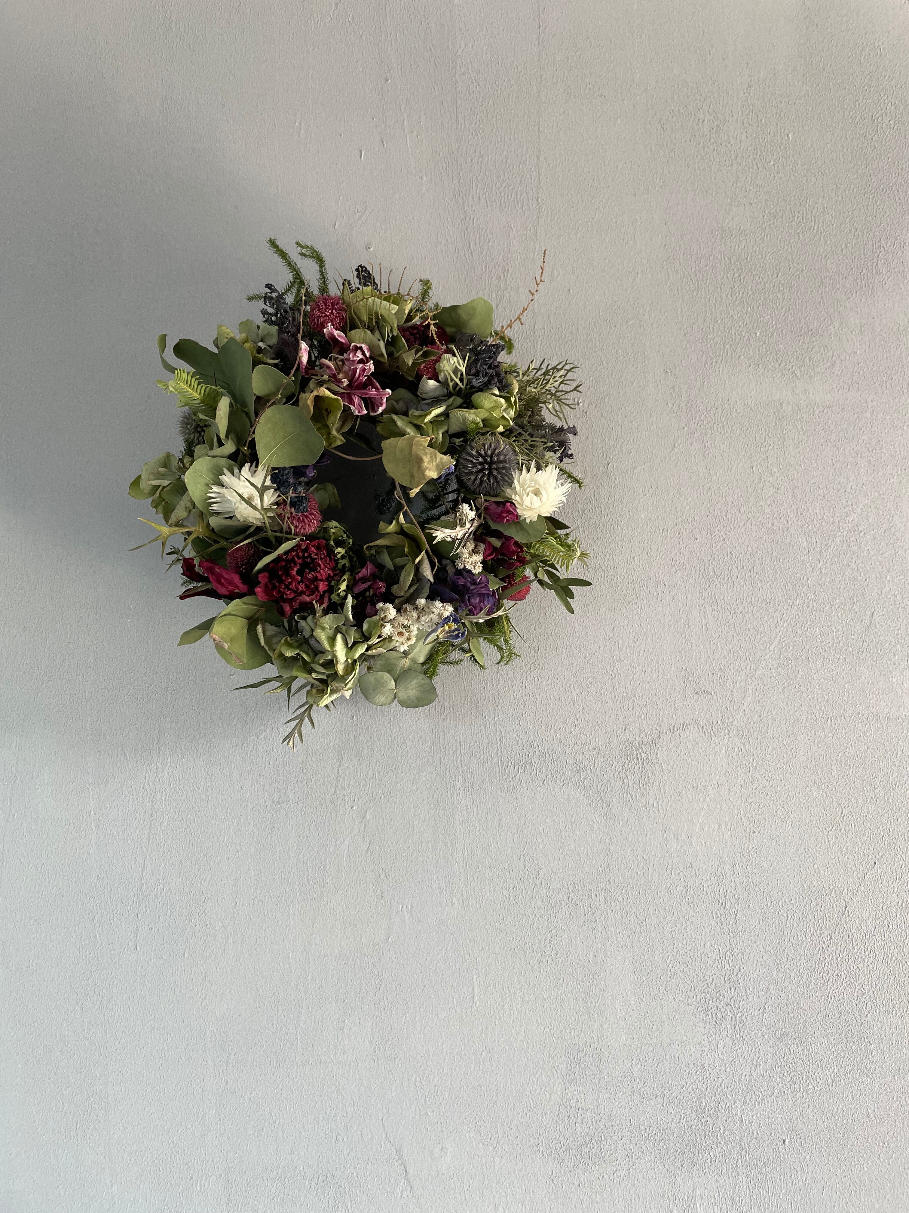 アンティーク紫陽花にシックな色合いのラナンキュラス、アネモネ、チューリップやユーカリなどをたっぷりと入れてリースを作りました。